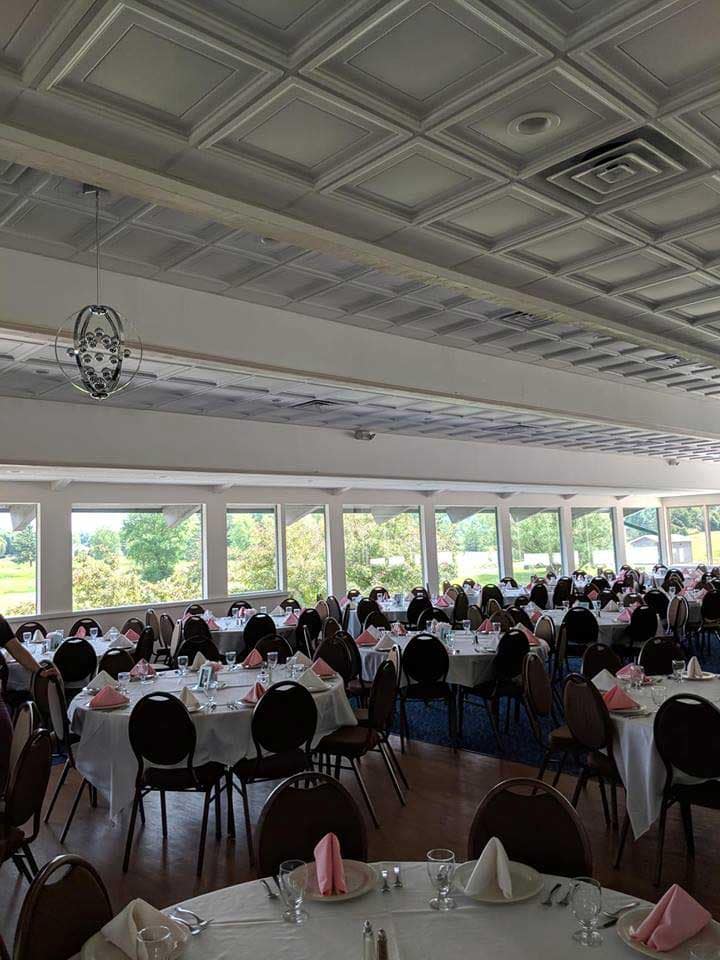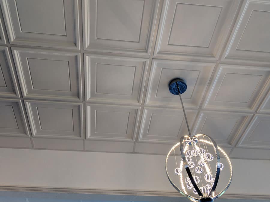 Persistent leaks had stained the existing ceiling tiles in the dining area, resulting in an unsightly aesthetic. A remodel and update fixed the leaks, while Genesis Coffer tiles provided a new, clean look for the room.