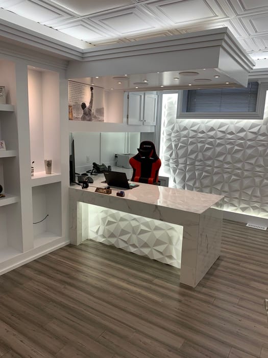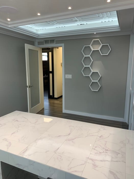 The owners of this firm chose a straightforward tile design in Genesis Icon Relief. The style coordinates well with the existing décor, while adding depth and subtle interest.