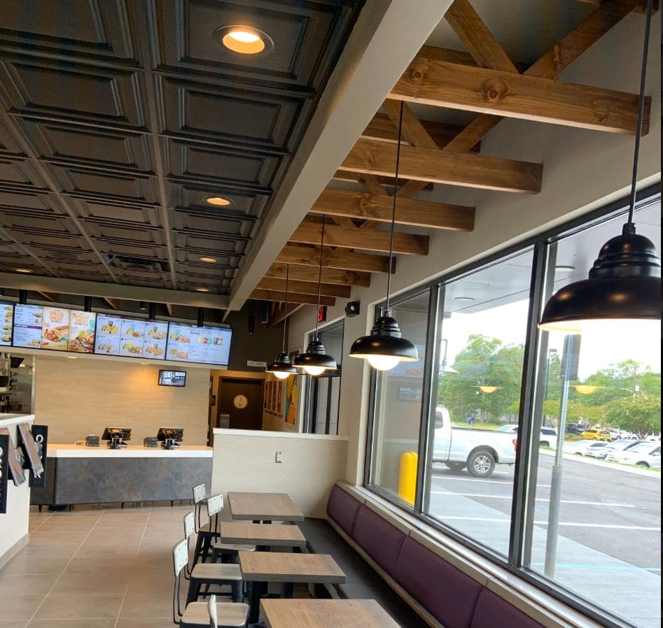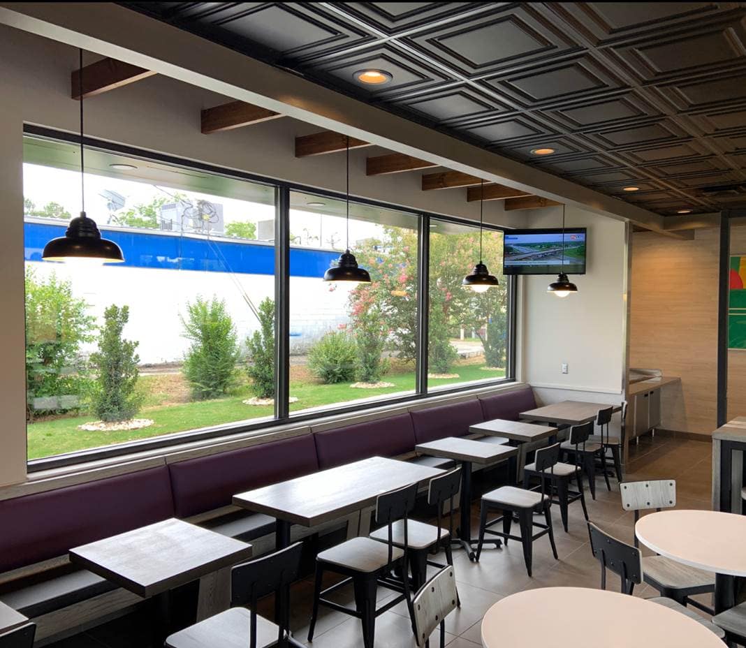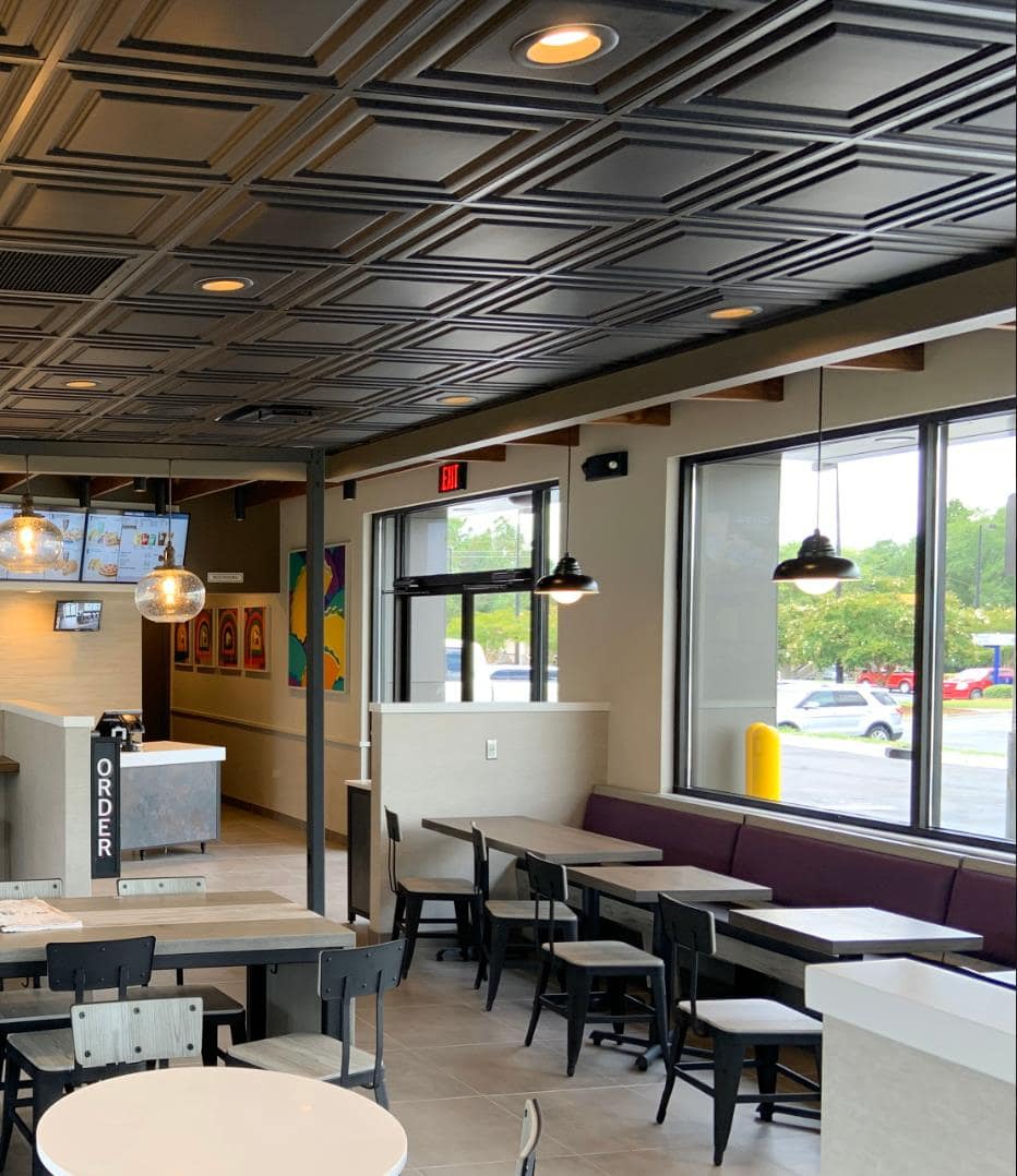 The franchise owner for this restaurant chose Genesis Icon Relief tiles in black for several store remodels. The black adds style and sophistication, but is waterproof, easy to clean and maintenance free.
