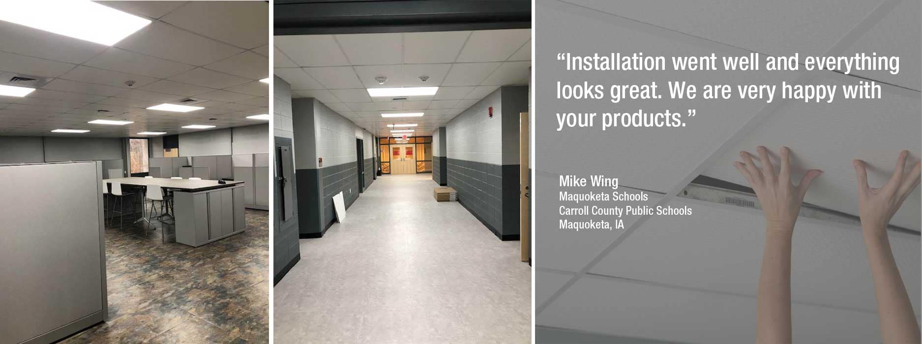 Genesis is an ideal solution for private and public learning facilities. Stop replacing water-damaged and stained mineral board ceiling tiles. Genesis ceiling panels will easily drop into your existing grid system and provide a substantial return on your investment. Locations such as labs, classrooms, hallways, office space and bathrooms are ideal locations for the Genesis ceiling panels, grid systems and accessories.
