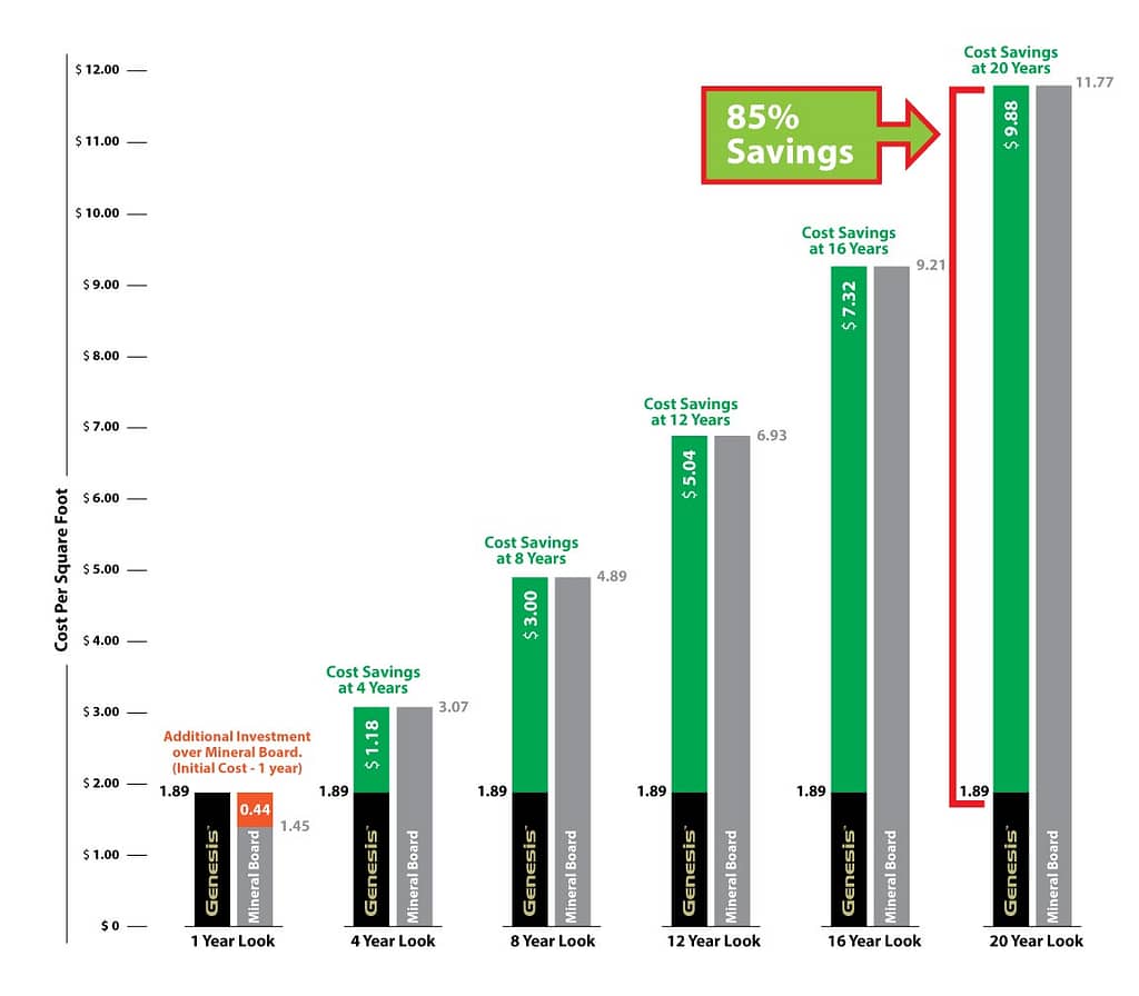 The investment in mineral board ceiling tiles therefore becomes ongoing, both in terms of materials and labor costs. With Genesis tiles, not only will you never have to replace the tiles again due to water damage and staining, but you will realize a significant savings over time. Costs shown in the graph below include labor.